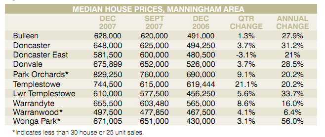 The latest data released by the real estate Institute of Victoria indicate that generally, prices in the Manningham area performed better than the overall Melbourne average. The breakdown for each suburb is shown in the table below.